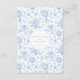 Elegant light blue floral porcelain inspired wedding details card with bohemian arch and bride and groom names at the back.