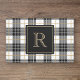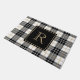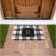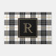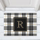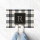 Custom-designed doormat for the holiday seasons featuring personalized monogram/family initial on festive black and brown Tartan/Scottish Plaid pattern.