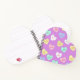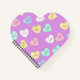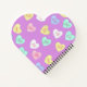 This cute heart notebook features a Valentine's Day theme. The background is a violet purple with classic Valentine heart candy. The colourful candies feature various sayings.