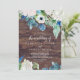 This classic white flowers rustic wedding invitation is perfect for a fall wedding. The elegant floral design features soft ivory and white roses, peonies, and chrysanthemum with touches of periwinkle blue watercolor flowers and green foliage on a faux brown wood background.