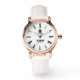 personalized watch, white dial, roman numerals, gold watch, luxury accessory, monogram gift, elegant wristwatch, white leather strap, timeless fashion, classic design