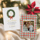 A timeless yet modern gold foil Christmas card design featuring a hand-painted evergreen wreath with a customizable monogram and elegant “Merry Christmas” in real raised gold foil script ink. The front includes your personalized holiday message and family name, while the classic red and green plaid backing adds a cozy, traditional touch. Choose to include a favorite family photo on the back. Easily edit the monogram, greeting, names, and year to suit couples, families, or individuals. A beautiful choice for anyone who loves classic holiday style with a clean, updated look.