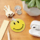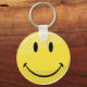 A keychain featuring a large classic yellow smiling face/happy face centred on the front.