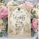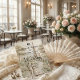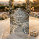 Transport guests to a romantic bygone era with this Regency-inspired engagement design, featuring a faux stone bas-relief effect and soft pastel florals.This design features a sophisticated trompe-l'œil (optical illusion) composition simulating the look of an antique stone carving. The visual center captures a silhouette of a couple in a traditional kneeling proposal pose, framed by an intricate archway of faux sculpted masonry. The "stone" features a warm, neutral cream and beige palette, accented by printed textures of pastel pink roses and sage green climbing vines that appear to grow over the arch. The typography hierarchy balances a bold Gothic blackletter font for the couple's names with a whimsical, flowing calligraphy script for the event details, set against a background of a distant gazebo temple and cobblestone path.