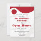 An invitation featuring a red and white colour scheme. Front features red design on top and illustration of red apple at top left. Swirl background. Personalise with teacher's name, grade, location, and date of your back to school open house orientation. Opposite side is solid red.