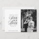 This classy elegant save the date card in black and white features a minimalist design with "save our date" styled in a mixture of classic text and elegant calligraphy script that lends a sophisticated, classy style with old money vibes. It also includes a placeholder for your photo that covers half of the front of the card. The back of the card includes an editable placeholder to indicate your wedding website URL, which can also be deleted if the URL is not yet available.