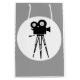 A stylish charcoal grey Gift Bag, with a digital illustration of a retro movie camera and tripod, and a white circle. Available in other options. Visit our store for more Cinema related Gift Bags and other Arty Gifts!