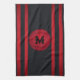 Modern, and gorgeously sleek initialled kitchen or hand towel perfect for business and home use with this black towel featuring red stripes and complimenting red circle with elegant scroll designs and a customisable Initial that may be changed to a monogram, family, or business name in what is currently a fitting, bold, ang gorgeous octopus grunge font complimenting this style.
