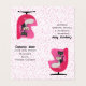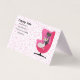This fold over standing business card is white with vibrant pink polka dots and two class cats, white with yellow eyes and black with green eyes sitting in a mid century style pink chair. Customise all your information on the front, back, and inside with the templates.