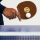 This classy chic ping pong paddle features a faux brown leather handle with a gold initial nameplate, combining elegance with performance. Perfect for those seeking a stylish yet functional addition to their game.