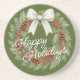 This beautifully designed holiday beverage coaster showcases elegant watercolor artwork of a wreath embellished with a white bow, pinecones, green holly leaves, red berries, and pine needles. Its classy yet rustic design captures the essence of the December holiday season and appeals to those who appreciate artistic illustrations. The coaster offers customisation options, allowing you to personalise it with your seasonal greeting, making it a thoughtful choice for spreading holiday cheer.