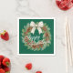 This beautifully designed holiday paper napkins showcases elegant watercolor artwork of a wreath embellished with a white bow, pinecones, green holly leaves, red berries, and pine needles. Its classy yet rustic design captures the essence of the December holiday season and appeals to those who appreciate artistic illustrations. The napkin offers customisation options, allowing you to personalise it with your seasonal greeting, making it a thoughtful choice for spreading holiday cheer.