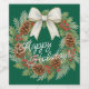This beautifully designed holiday wine bottle label showcases elegant watercolor artwork of a wreath embellished with a white bow, pinecones, green holly leaves, red berries, and pine needles. Its classy yet rustic design captures the essence of the December holiday season and appeals to those who appreciate artistic illustrations. The label offers customisation options, allowing you to personalise it with your seasonal greeting, making it a thoughtful choice for spreading holiday cheer.