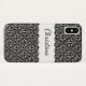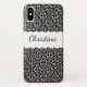 This iPhone X phone case has a classy elegant black and white damask pattern with fancy white scrolls. Customise your name in the white wavy border with the template.