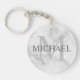 features personalised name in grey and monogram in light grey as background, in classic serif font style,