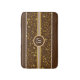 Golden music notes on a solid background contrasted by a slightly lighter shade of the colour in a rectangular band at the centre. Attached to this band is a Monogram focal point in white text.