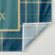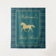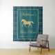 A preppy, classic baby shower photo booth backdrop or decor tapestry with equestrian and plaid elements in navy and hunter green with gold tone accents. A golden, trotting horse silhouette adorns the top and the tartan pattern adds a timeless touch. Perfect for an Old Money themed baby shower with a classic, vintage and luxurious feel. If you like grandpa core, vintage style this is a great baby shower theme. Customise this editable personalised baby shower backdrop template with your own event details.