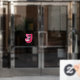 This window cling has two pretty class cats, one white and one black wearing diamond collars sitting in a bright pink mid centurey chair. Customise your text with the templates.