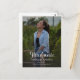 Classy script text "Graduate" two photo graduation announcement design featuring a large photo on front with a smaller square photo on the back and your graduation details below. The front template is set up for your graduating senior's name, class year and school on bottom underneath the script "Graduate". A black semi-opaque background overlays the photo to make the white text at the bottom pop. "Graduate" text style can only be edited by designer, but the colour is editable. Composite design by Holiday Hearts Designs (rights reserved) with template placeholder photos provided via Unsplash.