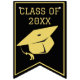 Simple yet stylish graduation party decorations gunting flags feature a gold border and modern gold text on a black background. A classy and elegant look for a high school or college graduate graduation party.