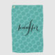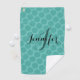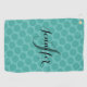 Trendy teal polka dotted pattern background with elegant script name and monogram centred on towel.