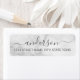 This return address label features personalised family name in grey modern script font with address in grey modern sans serif font on white marble background.