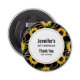 Birthday thank you bottle opener with an elegant and stylish pattern. Pretty yellow sunflowers and green leaves surrounded by delicate gold chains. Black background.