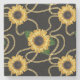 A stone coaster with an elegant and stylish pattern. Pretty yellow sunflowers and green leaves surrounded by delicate gold chains. Black background.