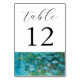 Wedding table numbers with Claude Monet Water Lilies painting background.