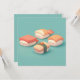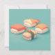 This heart-melting design features a group of four incredibly sweet sushi characters with simple, joyful faces and soft rosy cheeks. Rendered in a high-quality 3D clay style, the set includes a salmon nigiri with orange-and-white stripes, a rectangular tuna nigiri with deep red topping, a second salmon piece with unique markings, and a yellow tamago egg nigiri wrapped in a dark green seaweed band. The characters are made with a smooth, matte texture that mimics sculpted clay, and each piece features a chubby white rice body with a friendly, "kawaii" personality. Set against a clean, solid teal background, the overall aesthetic is modern, bright, and full of gentle charm, making it an irresistible choice for any fan of Japanese cuisine or whimsical food-themed art. This cheerful sushi postcard is a wonderful choice for sending a "soy happy for our friendship" note or a playful greeting to a fellow seafood lover. You might choose to use this cute food card for a Japanese-themed dinner party invitation or to celebrate a fun culinary milestone with your family members. It also makes a precious decorative piece for a kitchen wall or a bright addition to a food-themed scrapbook as a small token of happiness. This versatile design is also an excellent choice for restaurant grand opening announcements, sushi-making class invites, or as a heartwarming way to share a short message of joy for any situation or event.