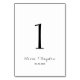 This wedding table number card has a clean, minimalist style, featuring a large bold number in the centre with elegant cursive text beneath it and a small line of simple sans-serif text at the bottom, all set against a white background for a Minimalist and sophisticated look.