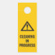 Cleaning in progress caution door knob hanger in black on caution yellow with a caution alert symbol. Cleaning service can hang on bathroom door or other business use to worn people the room is closed for cleaning. Same design on both sides.