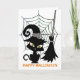 This little cat is "cleaning up the cobwebs”. Here’s a whimsical design with a black cat and broom. In a bright orange are the words “Happy Halloween”.