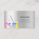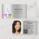 An elegant and glamourous business card on a faux silver looking background decorated with cleaning equipment. Personalise and add Your photo, name, text contact info and your own QR code to your website address.