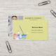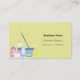A light yellow background decorated with cleaning equipment. Personalise and add Your photo, name, text contact info and your own QR code to your website address. Black text.