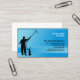 In this Cleaning Services business card, the silhouette of a window cleaner forms the main image over a striped gradient blue background. Customise this card immediately with your name and details.