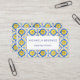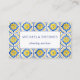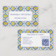 Imagine handing someone this cleverly designed business card. This has a pattern of blue and yellow tiles. Ideal for a business that offers cleaning services. The front is simple with the name and the service being offered. The reverse is where the magic happens. You have space to list your attributes or the skills or jobs you undertake. There is a place for two phone numbers and below is the QR code to link to your website or even a social media page for your business. At the top will be your call to action. Encourage your customer to make contact either by phone, or via the link. This pattern is reminiscent of a Mediterranean tiled home. So Fresh and bright. The text is in a complimentary colour of blue as is the QR code.