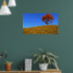 A peaceful 3D landscape in fall, created in Vue. On top of a hill covered with tall golden grass, against a clear blue sky, a solitary orange maple stands with a wooden bench under it to stop and rest on.
