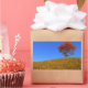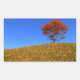 A peaceful 3D landscape in fall, created in Vue. On top of a hill covered with tall golden grass, against a clear blue sky, a solitary orange maple stands with a wooden bench under it to stop and rest on.
