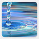 Clear blue water drops flowing into a pool of water.  The water is rippling in circles and there are colourful reflections in the water in an abstract pattern.