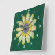 Crochet pattern of daisy in yellows, grey and hunter green. Clock numerals are in white.