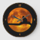 A beautiful and simple clock design with a large, orange, darker brown and yellow full moon at its centre and black background. The black silhouette of a thick tree branch crosses the moon, horizontally, at its lower part. On this branch a cat, also as a silhouette, sits, seemingly staring at the moon. The hour numbers are also in orange colour. An orange thin line runs along the edge of the clock.