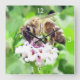 Honey bee collecting pollen from a blossom is on the left of the card. Close-up photograph viewed from the side, the legs, body, eyes, wings and antennae are clearly visible against the green background.