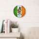 On an background that bears the colours of the Irish flag, stands elegantly, leaning on a cane and smiling, with mischief in his eyes, an Irish Leprechaun. He wears the traditional Irish leprechaun clothing. i.e. green hat, green coat, green trousers, striped socks. His beard - no moustache - and strands of hair are orange and his ears are pointy. His country of origin, Ireland, is written underneath him. The hour numbers of this clock design are transparent, with a darker glow around them. For our Irish friends, or all those who love Ireland!