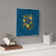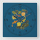 Koi swimming among lily pads and blossoms. Yellow, orange, and brown fish swimming among the green leaves and yellow flowers of lilies. Background a dark sea-blue. Original artwork by Susan Lilly