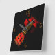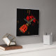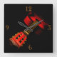 A clock design that shows a red acoustic guitar. The photograph is taken diagonal, up close to the head of the guitar, located at the bottom left, going upwards, following the fingerboard, towards the vague body of the guitar at the top right part of the picture. Only the four main hour numbers (i.e. 12, 3, 6, 9) are displayed in golden/orange colour. The background is black, which makes the red instrument really stand out!