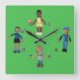 Dolls dressed for various sports, sit at the 12, 3, 6, and 9 positions. Two females, two males. Skin tones to represent various ethnicities. Sports shown, include tennis, baseball, gymnastics, and bicycling. Dolls stand in front of 3-d looking silver numerals on a green background.
