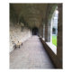 Hallway of a mediaeval inspired architectural feature known as a cloister. Repeating stone columns with the hint of a view of the sunny grass just inside the walls. Variations on the natural colours of the stone and shadows. An empty bench shows a quiet spot to sit and think. Bryn Mawr college campus.