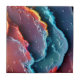 A close-up of a colourful, abstract painting. The surface is smooth and the colours are vibrant. The colours include blue, green, yellow, and pink.