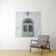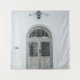 CLOSED GREY WOODEN DOOR BELOW BLACK LIGHT SCONCE TAPESTRY